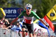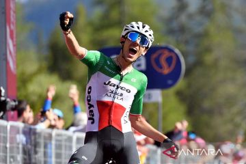 Pebalap sepeda dari Team Jayco Alula Filippo Zana berselebrasi setelah berhasil memenangkan etape 18 balap sepeda Giro d'Italia dengan rute Oderzo to Val di Zold, Italia, Kamis (25/5/2023). Etape 18 Giro d'Italia menempuh jarak 161 kilometer. ANTARA FOTO/Reuters/Jennifer Lorenzini/nym.