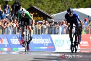 Pebalap sepeda dari Team Jayco Alula Filippo Zana (kiri) memasuki garis finis disusul pebalap sepeda Groupama - FDJ Thibaut Pinot (kanan) pada etape 18 balap sepeda Giro d'Italia dengan rute Oderzo to Val di Zold, Italia, Kamis (25/5/2023). Etape 18 Giro d'Italia menempuh jarak 161 kilometer. ANTARA FOTO/Reuters/Jennifer Lorenzini/nym.