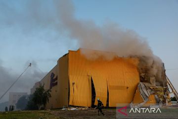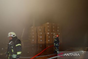 Petugas pemadam kebakaran di lokasi pabrik tembakau yang mengalami kerusakan akibat serangan drone bunuh diri Rusia, di Kyiv, Ukraina (28/5/2023). Angkatan Udara Ukraina menyatakan telah menjatuhkan 52 dari 54 drone yang diluncurkan Rusia. ANTARA FOTO/REUTERS/Valentyn Ogirenko/tom.