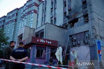 Tim penyelamat bekerja di lokasi bangunan yang rusak akibat serangan drone bunuh diri Rusia, di Kyiv, Ukraina (28/5/2023). Angkatan Udara Ukraina menyatakan telah menjatuhkan 52 dari 54 drone yang diluncurkan Rusia. ANTARA FOTO/REUTERS/Valentyn Ogirenko/tom.