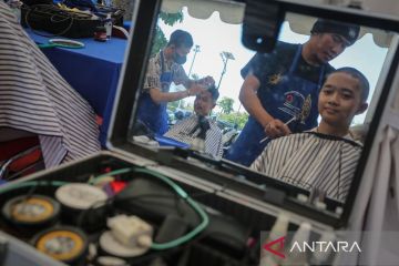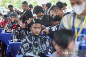 Tukang cukur memotong rambut warga pada Pesta Cukur Rambut Gratis se-Indonesia di Mangkunegaran, Solo, Jawa Tengah, Minggu (28/5/2023). Pesta cukur rambut gratis yang digelar secara daring oleh Ikatan Istri Karyawan dan Karyawati (Ikawati) Kementerian Agraria dan Tata Ruang/Badan Pertanahan Nasional (ATR/BPN) tersebut untuk memecahkan rekor Museum Rekor Indonesia (MURI) dengan cukur rambut terbanyak yang melibatkan 1.120 kapster dan peserta cukur rambut terbanyak yang ditargetkan mencapai lima ribu orang. ANTARA FOTO/Mohammad Ayudha/tom.