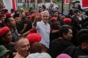 Bakal calon presiden dari PDI Perjuangan Ganjar Pranowo(tengah) menyapa warga setibanya di GOR Gondrong, Kota Tangerang, Banten, Minggu (28/5/2023). Dalam kunjungannya, Ganjar Pranowo menemui para tokoh milenial, pelaku seni dan pelaku UMKM untuk mendengarkan aspirasinya. ANTARA FOTO/Fauzan/hp.