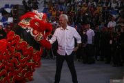 Bakal calon presiden dari PDI Perjuangan Ganjar Pranowo (kanan) berbincang dengan pemain barongsai di GOR Gondrong, Kota Tangerang, Banten, Minggu (28/5/2023). Dalam kunjungannya, Ganjar Pranowo menemui para tokoh milenial, pelaku seni dan pelaku UMKM untuk mendengarkan aspirasinya. ANTARA FOTO/Fauzan/hp.