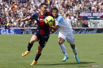Pesepak bola Bologna Andrea Cambiaso (kiri) berebut bola dengan pesepak bola Napoli Bartosz Bereszynski dalam laga lanjutan Liga italia, di Stadion Renato Dall'Ara, Bologna, Italia, Minggu 928/5/2023)). Pertandingan berakhir imbang 2-2. ANTARA FOTO/Reuters-Ciro De Luca/hp.