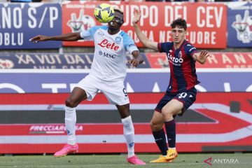 Pesepak bola Napoli Victor Osimhen (kiri) berebut bola dengan pesepak bola Bologna Andrea Cambiaso dalam laga lanjutan Liga italia, di Stadion Renato Dall'Ara, Bologna, Italia, Minggu 928/5/2023)). Pertandingan berakhir imbang 2-2. ANTARA FOTO/Reuters-Ciro De Luca/hp.