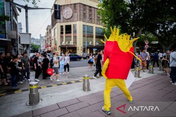 Penjual mengenakan pakaian maskot keripik berdiri di pasar di sebuah jalan di Shanghai, China (27/5/2023). ANTARA FOTO/REUTERS/Aly Song/aww.