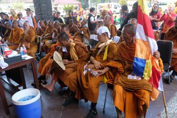 Sejumlah biksu peserta ritual Thudong beristirahat di Mapolresta Magelang pada rute terakhir Magelang-Borobudur di Borobudur, Magelang, Jawa Tengah, Rabu (31/5/2023). Pada rute terakhir para biksu menempuh jarak 18 kilometer dan singgah di sejumlah tempat untuk istirahat dan berdoa. ANTARA FOTO/Anis Efizudin/hp.