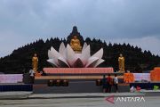 Pekerja menyelesaikan pembuatan altar saat persiapan hari raya Tri Suci Waisak 2567 BE/ 2023 di lapangan Kenari kompleks Candi Borobudur, Magelang, Jawa Tengah, Kamis (1/6/2023). Panitia penyelenggara memperkirakan sedikitnya 4.500 umat Buddha dari berbagai wilayah akan hadir pada puncak perayaan Tri Suci Waisak 2567 BE/ 2023 pada (4/6) mendatang 2023. ANTARA FOTO/Anis Efizudin/aww.