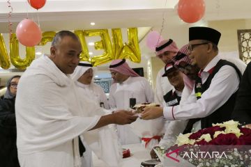 Ketua PPIH Arab Saudi Subhan Cholid (kanan) menyerahkan kue kepada jamaah calon haji kloter SOC 01 setibanya di hotel kawasan Mekah, Arab Saudi, Kamis (1/6/2023). Sebanyak 1.897 jamaah yang terbagi dalam lima kloter tiba perdana di Mekah usai menjalankan ibadah sunah Arbain di Madinah. ANTARA FOTO/Wahyu Putro A/aww.