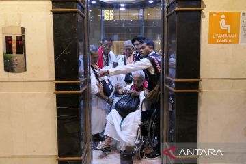 Petugas membantu jamaah calon haji kloter SOC 01 menaiki lift setibanya di Hotel kawasan Mekah, Arab Saudi, Kamis (1/6/2023). Sebanyak 1.897 jamaah yang terbagi dalam lima kloter tiba perdana di Mekah usai menjalankan ibadah sunah Arbain di Madinah. ANTARA FOTO/Wahyu Putro A/aww.