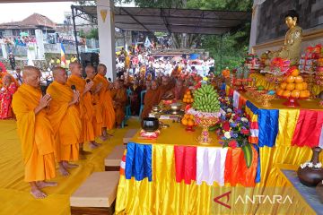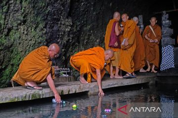Sejumlah biksu melakukan puja bakti saat prosesi pengambilan air suci pada rangkaian Tri Suci Waisak 2567 BE/2023 di Umbul Jumprit, Tegalrejo, Ngadirejo, Jawa Tengah, Sabtu (3/6/2023). Air suci yang merupakan simbol kesejukan dan kejernihan hati itu selanjutnya akan disemayamkan di candi Mendut untuk dibawa ke candi Borobudur pada puncak perayaan Waisak. ANTARA FOTO/Anis Efizudin/nym.