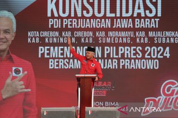Bakal calon presiden dari PDIP Ganjar Pranowo memberikan sambutan saat Konsolidasi Pemenangan Bacapres PDIP di Cirebon, Jawa Barat, Sabtu (3/6/2023). Agenda tersebut merupakan bagian dari rangkaian safari politik Ganjar Pranowo ke Pantura Cirebon untuk mengkonsolidasikan massa pendukung. ANTARA FOTO/Amrin Aming/rwa.