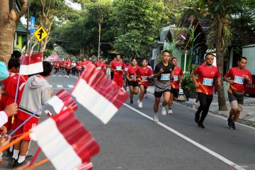 Pelari beradu kecepatan dalam lomba lari Bung Karno Run 2023 di Blitar, Jawa Timur, Minggu (4/5/2023). Lomba yang diikuti sekitar 900 peserta dari dalam dan luar negeri itu untuk menyemarakkan peringatan Bulan Bung Karno yang diperingati setiap bulan Juni dan sebagai ajang promosi pariwisata daerah. ANTARA FOTO/Irfan Anshori/hp.