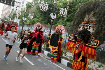 Sejumlah seniman reog memberikan semangat kepada pelari dalam lomba lari Bung Karno Run 2023 di Blitar, Jawa Timur, Minggu (4/5/2023). Lomba yang diikuti sekitar 900 peserta dari dalam dan luar negeri itu untuk menyemarakkan peringatan Bulan Bung Karno yang diperingati setiap bulan Juni dan sebagai ajang promosi pariwisata daerah. ANTARA FOTO/Irfan Anshori/hp.