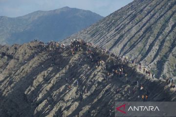 Masyarakat Suku Tengger merayakan Yadnya Kasada di Gunung Bromo, Probolinggo, Jawa Timur, Senin (5/6/2023). Yadnya Kasada merupakan upacara adat masyarakat Suku Tengger sebagai bentuk ucapan syukur kepada Sang Hyang Widhi dan para leluhur. ANTARA FOTO/Irfan Sumanjaya/tom.