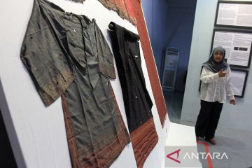 Pengunjung memerhatikan Songket Candung yang dipamerkan di Galeri Taman Budaya Sumatera Barat, Padang, Jumat (6//9/2023). Pameran yang berlangsung sampai 15 Juni 2023 tersebut menampilkan 24 songket hasil revitalisasi oleh Nanda Wirawan untuk membangkitkan kembali budaya kerajinan tenun. ANTARA FOTO/Muhammad Arif Pribadi/nym.