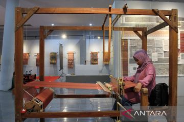 Perajin menunjukkan cara menggunakan alat tenun saat pameran Songket Candung di Galeri Taman Budaya Sumatera Barat, Padang, Jumat (6//9/2023). Pameran yang berlangsung sampai 15 Juni 2023 tersebut menampilkan 24 songket hasil revitalisasi oleh Nanda Wirawan untuk membangkitkan kembali budaya kerajinan tenun. ANTARA FOTO/Muhammad Arif Pribadi/nym.