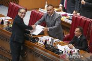 Wakil Ketua Komisi XI DPR Dolfie Othniel Frederic Palit (kiri) menyerahkan laporan Hasil Uji Kelayakan Calon Anggota BPK Periode 2023-2028 kepada Wakil Ketua DPR Lodewijk Paulus (tengah) dan Sufmi Dasco Ahmad (kanan) saat Rapat Paripurna ke-26 Masa Persidangan 5 Tahun Sidang 2022-2023 di Kompleks Parlemen, Senayan, Jakarta, Selasa (13/6/2023). Dalam rapat tersebut Komisi XI DPR mengesahkan Slamet Edy Purnomo sebagai calon anggota BPK terpilih periode 2023-2028 menggantikan Agus Joko Pramono. ANTARA FOTO/Rivan Awal Lingga/nym.