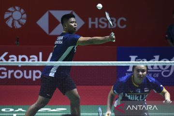 Pebulu tangkis ganda campuran Indonesia Praveen Jordan (kiri) dan Melati Daeva Oktavianti (kanan) mengembalikan kok ke arah lawannya ganda campuran Hongkong Tang Chun Man dan Tse Ying Suet dalam babak 16 besar turnamen Indonesia Open 2023 di Istora Senayan, Jakarta, Kamis (15/6/2023). Praveen dan Melati gagal melaju ke babak selanjutnya usai kalah dalam dua gim (17-21, 14-21). ANTARA FOTO/M Risyal Hidayat/tom.