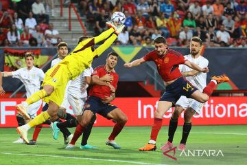 Pemain Spanyol Joselu berselebrasi setelah mencetak gol ke gawang Italia dalam pertandingan Semi Final sepak bola UEFA Nations League di De Grolsch Veste, Enschede, Belanda, Jumat (16/6/2023). Spanyol lolos ke final UEFA Nations League setelah menang atas Italia 2-1 dan akan berhadapan dengan Kroasia di laga final. ANTARA FOTO/Reuters/Wolfgang Rattay/nym.