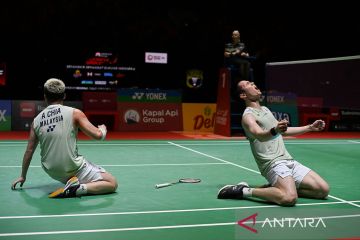 Pebulu tangkis ganda putra Malaysia Aaron Chia (kiri) dan Soh Wooi Yik (kanan) berselebrasi usai mengalahkan ganda putra Indonesia Pramudya Kusumawardana dan Yeremia Erich Rambitan dalam babak semifinal Indonesia Open 2023 di Istora Senayan, Jakarta, Sabtu (17/6/2023). Aaron dan Soh menang dalam rubber gim (12-21, 23-21, 21-13) sehingga melaju ke babak final. ANTARA FOTO/Aditya Pradana Putra/pras.