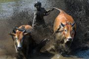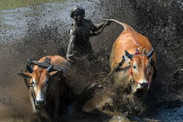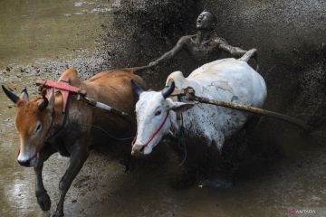 Joki memacu dua ekor sapinya saat digelarnya ajang Pacu Jawi di Nagari Padang Laweh, Sunga Tarab, Tanah Datar, Sumatera Barat, Sabtu (17/6/2023). Setelah sempat berhenti dua pekan pada Mei lalu, atraksi anak nagari tersebut kembali digelar menghibur warga tiap bulan mendukung program Visit Beautiful West Sumatra (VBWS) 2023. ANTARA FOTO/Iggoy el Fitra/foc.