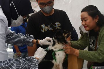 Dokter hewan menyuntikkan vaksin rabies ke seekor kucing saat pelayanan gratis vaksinasi rabies di Dinas Ketahanan Pangan dan Pertanian Kota Madiun, Jawa Timur, Kamis (22/6/2023). Layanan oleh Dinas Ketahanan Pangan dan Pertanian bekerja sama dengan Perhimpunan Dokter Hewan Indonesia (PDHI) Jatim V tersebut untuk melindungi hewan piaraan anjing maupun kucing dari rabies. ANTARA FOTO/Siswowidodo/hp.