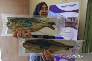 Pemilik usaha menunjukkan ikan bandeng presto hasil buatannya di rumah produksi Bandeng Presto Blendug, Semarang, Jawa Tengah, Jumat (23/6/2023). Dalam sebulan rumah produksi tersebut dapat menghasilkan lima ribu ekor ikan bandeng presto yang kemudian dipasarkan melalui daring ke berbagai wilayah di Indonesia dan telah menembus pasar mancanegara seperti Hong Kong, Jepang serta Malaysia dengan harga jual Rp25 ribu hingga Rp35 ribu per dus tergantung beratnya. ANTARA FOTO/Makna Zaezar/rwa.