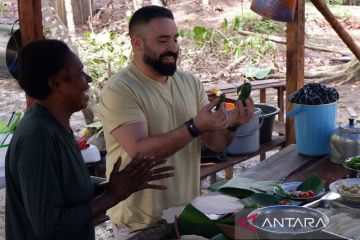 Koki asal Qatar Hassan Al Ibrahim (kanan) bersama seorang mama Papua memperlihatkan bahan yang digunakan pada demo memasak masakan Qatar dalam Culinary Journey Qatar-Indonesia 2023 Year of Culture di Isyo Hill's, Distrik Nimbrokrang, Kabupaten Jayapura, Papua, Jumat (23/6/2023). Pada kegiatan tersebut koki asal Qatar dan mama-mama Papua saling memperkenalkan cara mengolah dan memasak khas daerah mereka masing-masing. ANTARA FOTO/Sakti Karuru/tom.