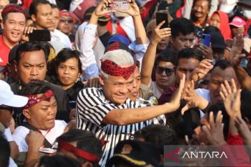 Bakal calon presiden dari PDI Perjuangan Ganjar Pranowo menyapa warga saat menghadiri Gerak Jalan Kebangsaan di Nganjuk, Jawa Timur, Jumat (23/6/2023). Gerak jalan sore yang diselenggarakan relawan desa paguyuban sedulur Ganjar tersebut diikuti oleh ribuan warga dari sejumlah daerah. ANTARA FOTO/Prasetia Fauzani/tom.