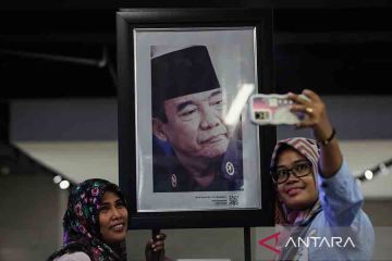 Warga berswafoto berlatar belakang foto Presiden pertama Republik Indonesia Ir. Soekarno yang dipajang pada pameran foto Bung Karno Aku Arek Suroboyo di ruang bawah tanah Alun-Alun Surabaya, Jawa Timur, Minggu (25/6/2023). Pameran yang digelar dalam rangka memperingati Bulan Bung Karno dan berlangsung sampai 30 Juni 2023 tersebut menggambarkan perjalanan hidup Presiden pertama Republik Indonesia Ir. Soekarno. ANTARA FOTO/Didik Suhartono/rwa.