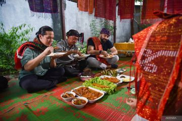 Koki asal Qatar Hassan Al Ibrahim (kanan) bersama Top tiga MasterChef Indonesia Musim ke sembilan Arsyan Dwianto (kiri) dan pemerhati budaya Batak Toga Nainggolan (tengah) menyantap hidangan khas Batak Toba pada saat Culinary Journey Qatar-Indonesia 2023 Year of Culture di Medan, Sumatera Utara, Senin (26/6/2023). Kegiatan memasak tersebut bertujuan untuk saling memperkenalkan cara mengolah makanan khas daerah masing-masing dan memperdalam pemahaman antarbangsa lewat makanan. ANTARA FOTO/Fransisco Carolio/foc.