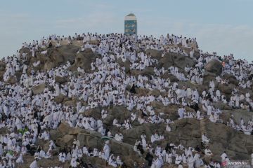 Umat Islam dari berbagai negara melaksanakan wukuf di Jabal Rahmah, Arafah, Arab Saudi, Selasa (27/6/2023). jutaan jamaah haji dari berbagai negara berkumpul di Arafah untuk melaksanakan wukuf yang merupakan rukun haji pada prosesi puncak haji 1444 H. ANTARA FOTO/Wahyu Putro A/hp.
