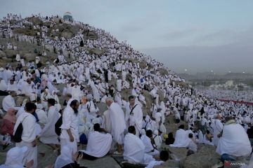 Umat Islam dari berbagai negara melaksanakan wukuf di Jabal Rahmah, Arafah, Arab Saudi, Selasa (27/6/2023). jutaan jamaah haji dari berbagai negara berkumpul di Arafah untuk melaksanakan wukuf yang merupakan rukun haji pada prosesi puncak haji 1444 H. ANTARA FOTO/Wahyu Putro A/nym.