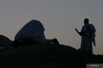Umat Islam berdoa saat melaksanakan wukuf di Jabal Rahmah, Arafah, Arab Saudi, Selasa (27/6/2023). jutaan jamaah haji dari berbagai negara berkumpul di Arafah untuk melaksanakan wukuf yang merupakan rukun haji pada prosesi puncak haji 1444 H. ANTARA FOTO/Wahyu Putro A/hp.