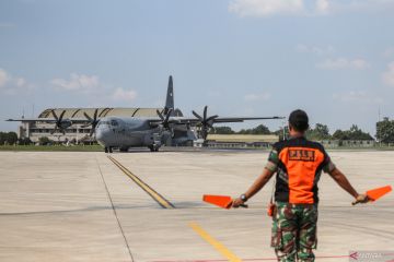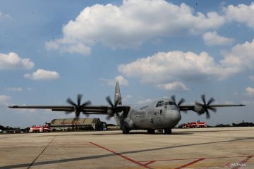 Crew pesawat memeriksa pesawat C130J Super Hercules usai tiba di Lanud Halim Perdanakusuma, Jakarta, Rabu (28/6/2023). Pesawat C130J Super Hercules TNI AU yang kedua dari lima unit yang dipesan Pemerintah melalui Kementerian Pertahanan telah tiba di Indonesia yang nantinya akan diserahkan oleh Menteri Pertahanan Prabowo Subianto kepada TNI AU guna memperkuat matra udara. ANTARA FOTO/Asprilla Dwi Adha/hp.