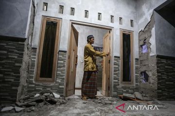 Warga menunjukkan rumah yang rusak pascagempa di Pacarejo, Gunungkidul, DI Yogyakarta, Sabtu (1/7/2023). Menurut data BPBD DIY dampak gempa bumi berkekuatan Magnitudo 6,4 yang berpusat 86 kilometer barat daya Kabupaten Bantul terdapat di 19 titik yang tersebar di Kabupaten Bantul, Kulonprogo dan Gunungkidul. ANTARA FOTO/Hendra Nurdiyansyah/aww.