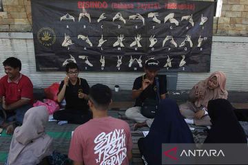 Warga belajar Bahasa Isyarat Indonesia (Bisindo) saat Hari Bebas Kendaraan Bermotor (Car Free Day) di Jalan Darmo, Surabaya, Jawa Timur, Minggu (2/7/2023). Pembelajaran bahasa isyarat secara gratis tersebut untuk memberikan keterampilan menggunakan bahasa isyarat kepada masyarakat luas sebagai sarana komunikasi dengan penyandang tunarungu ataupun tunawicara. ANTARA FOTO/Didik Suhartono/rwa.