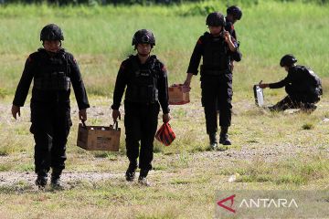 Sejumlah personel dari Tim Jibom Gegana Satuan Brimob Polda Sumatera Barat memperlihatkan bom ikan rakitan yang diurai saat pemusnahan di Lapangan GOR Rawang, Kota Pariaman, Sumatera Barat, Minggu (2/7/2023). Tim Jibom Gegana Satuan Brimob Polda Sumatera Barat memusnahkan 10 botol bom ikan rakitan dan ranjau aktif bekas peninggalan penjajahan Jepang yang ditemukan pada 2021. ANTARA FOTO/Muhammad Arif Pribadi/rwa.