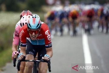 Pebalap Pascal Eenkhoorn dari LottoâDstny memacu sepedanya saat menempuh etape 2 Tour de France dari Vitoria Gasteiz ke San Sebastian, Spanyol (2/7/2023). ANTARA FOTO/REUTERS/Stephane Mahe/tom.