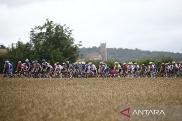 Sejumlah pebalap memacu sepedanya saat menempuh etape 2 Tour de France dari Vitoria Gasteiz ke San Sebastian, Spanyol (2/7/2023). ANTARA FOTO/REUTERS/Stephane Mahe/tom.
