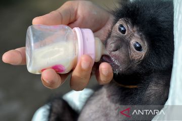 Seekor bayi siamang (Symphalangus syndactylus) mendapatkan susu dari perawat di kandang rawat Kebun Binatang Taman Rimba Jambi, Jambi, Selasa (4/7/2023). Bayi siamang yang lahir prematur pada Maret 2023 dari induk betina Mongky dan pejantan Keling di kebun binatang setempat itu terpaksa mendapatkan perawatan terpisah akibat diterlantarkan induknya. ANTARA FOTO/Wahdi Septiawan/Spt.