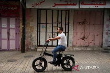 Seorang pria Palestina mengendarai sepeda melewati pertokoan yang tutup selama pemogokan umum atas operasi militer Israel di Jenin, Hebron,Tepi Barat, Palestina, Selasa (4/7/2023). Israel melakukan aksi militer besar-besaran untuk menduduki Jenin yang mengakibatkan sejumlah warga Palestina tewas. ANTARA FOTO/REUTERS/Mussa Qawasma/Spt.