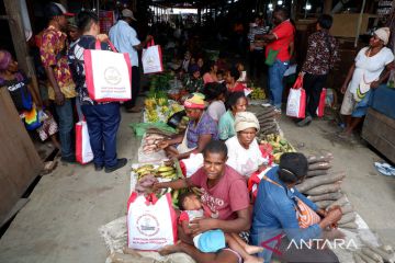 Petugas membagikan paket sembako bantuan presiden kepada mama-mama yang berdagang di Pasar Pharaa, Distrik Sentani, Kabupaten Jayapura, Papua, Jumat (7/7/2023). Sedikitnya 800 paket sembako dibagikan dan diharapkan dapat membantu meringankan kebutuhan para pedagang di sekitar itu. ANTARA FOTO/Sakti Karuru/Spt.