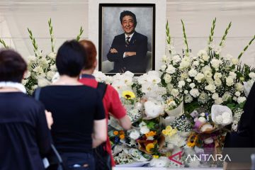 Para pelayat mempersembahkan bunga dan doa untuk mendiang Perdana Menteri Jepang Shinzo Abe, yang ditembak saat berkampanye untuk pemilihan parlemen pada tahun 2022, dalam upacara peringatan satu tahun pembunuhannya di kuil Zojoji, Tokyo, Jepang, Sabtu (8/7/2023). ANTARA FOTO/REUTERS/Issei Kato/aww.