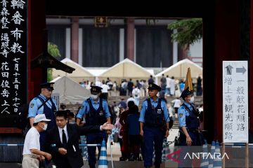 Petugas polisi berjaga di pintu masuk saat pelayat menawarkan bunga dan doa untuk mendiang Perdana Menteri Jepang Shinzo Abe, yang ditembak saat berkampanye untuk pemilihan parlemen pada tahun 2022, dalam upacara peringatan satu tahun pembunuhannya di kuil Zojoji, Tokyo, Jepang, Sabtu (8/7/2023). ANTARA FOTO/REUTERS/Issei Kato/aww.
