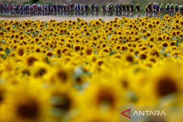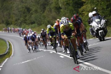 Sejumlah pebalap mengayuh sepedanya dalam sebuah peloton pada etape 8 Tour de France di Prancis, Sabtu (8/7/2023). Etape 8 berjarak 200,7 km dari Libourne ke Limoges, Prancis. ANTARA FOTO/Reuters/Stephane Mahe/nym.