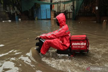 Pengendara roda dua melintasi banjir yang merendam jalanan New Delhi saat hujan lebat bawaan musim hujan di India, Sabtu (8/7/2023). ANTARA FOTO/REUTERS/Anushree Fadnavis/foc.