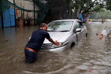 Warga mendorong mobilnya yang terjebak banjir saat hujan lebat bawaan musim hujan di New Delhi, India, Sabtu (8/7/2023). ANTARA FOTO/REUTERS/Anushree Fadnavis/foc.
