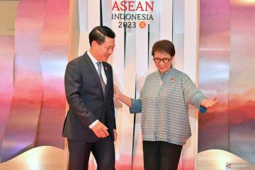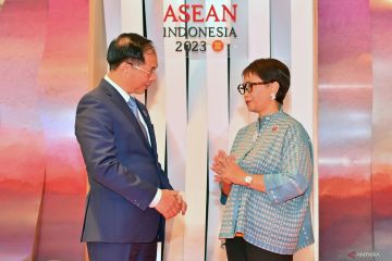 Menteri Luar Negeri Retno Marsudi (kanan) menyambut kedatangan Menteri Luar Negeri Vietnam Bui Thanh Son (kiri) sebelum Pertemuan ke-56 Menteri Luar Negeri ASEAN (AMM) di Jakarta, Selasa (11/7/2023). Pertemuan tersebut membahas pembangunan masyarakat ASEAN, kerjasama dengan mitra ASEAN serta mempersiapkan KTT ASEAN ke-43 pada bulan September mendatang. ANTARA FOTO/M Risyal Hidayat/hp.